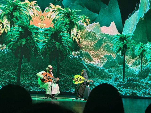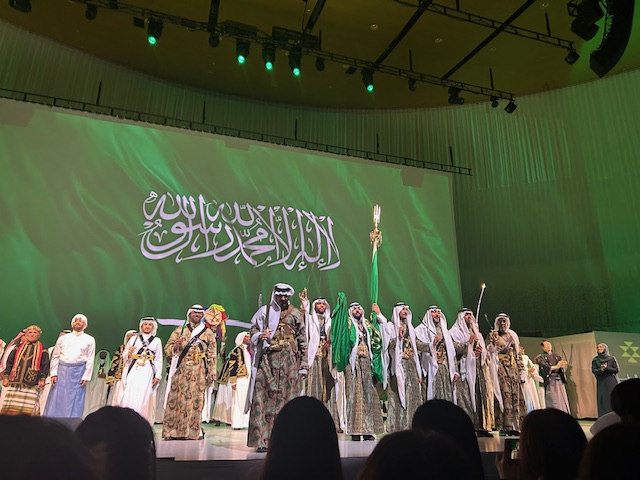 日本は経済産業省大串副大臣、サウジアラビアの皇太子のスピーチ。日本とサウジアラビアとの外交関係樹立70周年記念、ナショナルデー当日は、サウジアラビアの95年目の建国記念日でした。その記念すべき日にスクリーンをバックに歌と音楽のライブが感動的でした。9時入場からイベント会場付近で待ち、11時から午後1時まで待った疲れが吹き飛び、来てよかった~と思いました。