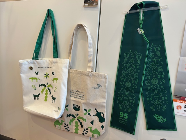 左がサウジアラビアパビリオンで売っていたトートバッグ。中央、記念式典出席者へのお土産トートバッグ。右が記念式典出席者へのお土産スカーフ。